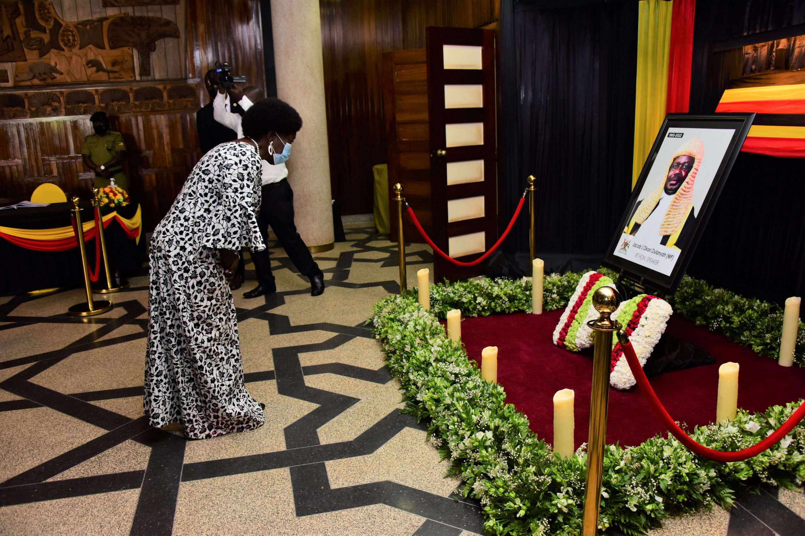 Kadaga, who used her private car, went straight to the Lobby and Paid respects to the Fallen Speaker Oulanyah’s portrait before proceeding to tender her message in the condolence book.